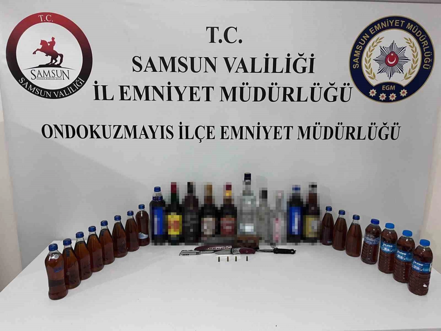 Samsun’un 19 Mayıs ilçesinde yapılan denetimde 1.64 promil alkollü olduğu belirlenen sürücünün aracından şişeler içinde el yapımı sahte içki, bıçak ve fişek ele geçirildi.