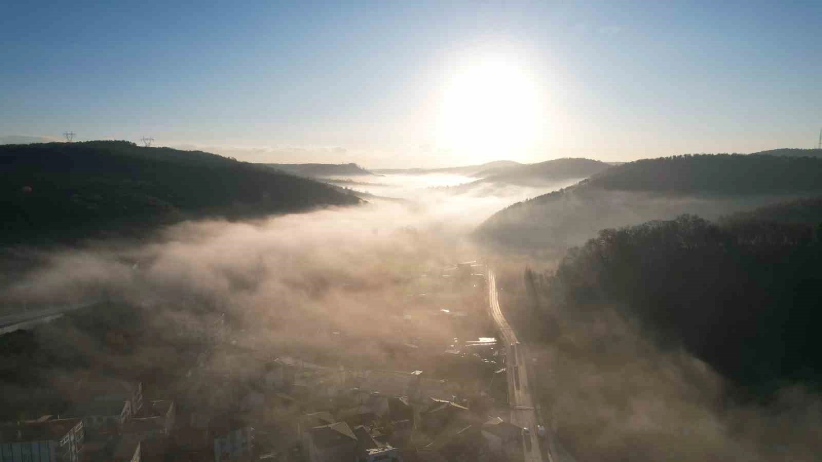 Görüntülerde sis bulutlarının mahalleyi tamamen kapladığı, ağaçların ve evlerin kısmen görünür hale geldiği, güneşin sisin arasından süzülerek manzarayı aydınlattığı anlar yer alıyor.