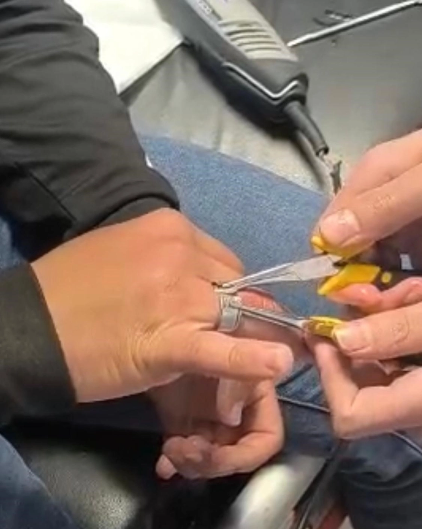 Yüzük yapılan müdahale ile sıkışan parmaktan çıkarıldı.