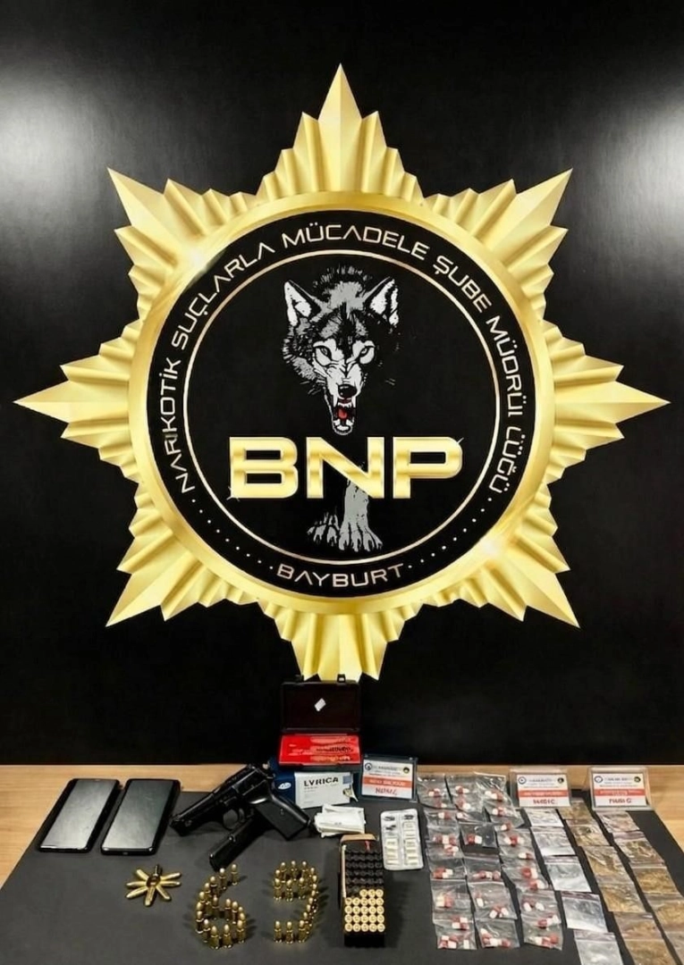 Aramada, 1 ruhsatsız tabanca ve şarjör, 64 adet 9x19 milimetre fişek, 27 paket satışa hazır 51 adet sentetik ecza, 11 paket satışa hazır bonzai, 5 paket satışa hazır metamfetamin ile 1 blister ambalajlı satışa hazır 10 adet sentetik ecza ele geçirildi.