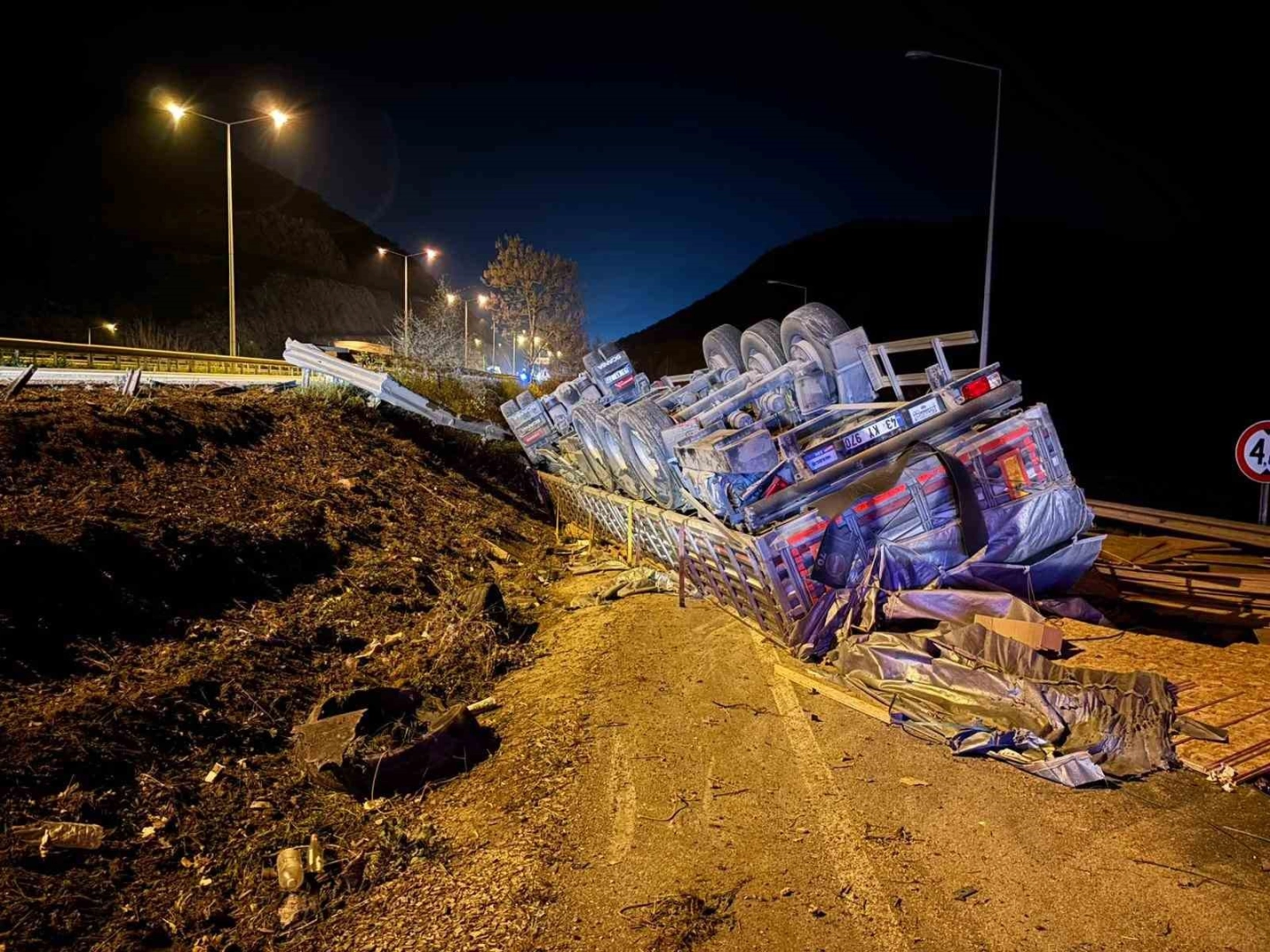 Kaza, dün gece, Vezirhan Beldesi girişi bağlantı yolu mevkiinde meydana geldi. Edinilen bilgilere göre Bilecik’ten Sakarya yönüne seyreden 43 KY 775 plakalı sunta yüklü tır sürücüsü Coşkun Ö. bir anda aracın direksiyon hakimiyetini kaybetti. Kontrolden çıkan tır devrilirken, dorsesindeki suntalar yola saçıldı. Meydana gelen trafik kazasında araç sürücüsü Coşkun Ö. yaralandı. Yaralı olay yerine gelen acil servis ekiplerince yapılan ilk müdahalenin ardından Bilecik Eğitim ve Araştırma Hastanesine kaldırıldı.