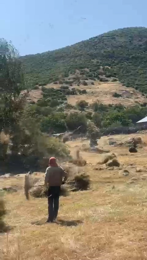 Bingöl’de çıkan hortum, tarlada çiftçilerin topladığı otları uçurdu.