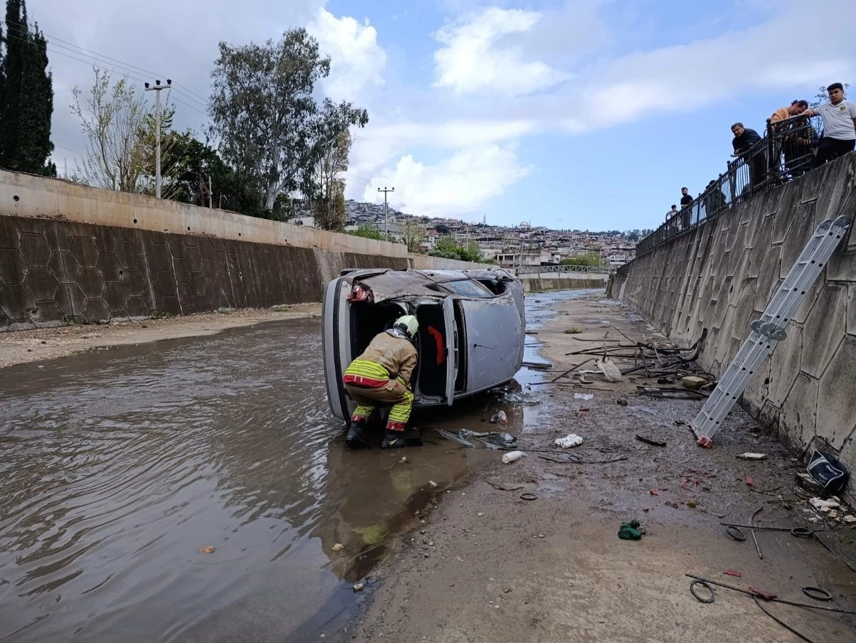 Hatay’a sürücüsünün direksiyon hakimiyetini kaybetmesiyle kanala düşerek yan yatan otomobildeki 2 kişi yaralandı.