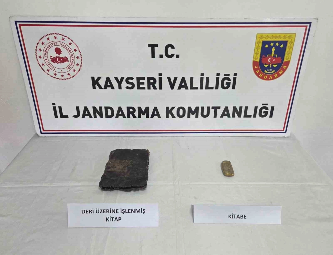 Kayseri İl Jandarma Komutanlığı ekiplerince yapılan çalışmalarda; 1 adet el yazması kitap ile 1 adet kitabe ele geçirildi.