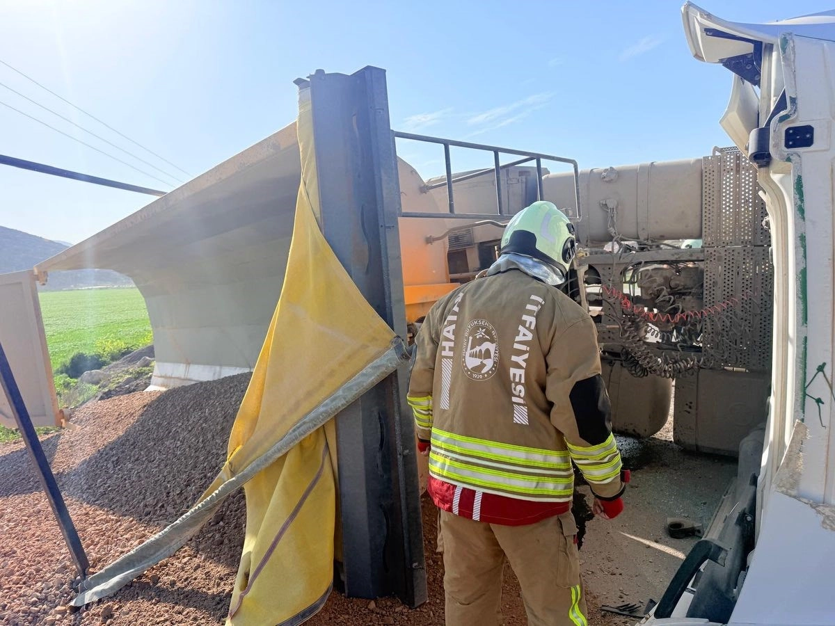 Hatay’da sürücünün kontrolünü kaybetmesiyle devrilen hafriyat kamyonunun sürücüsü yaralandı.