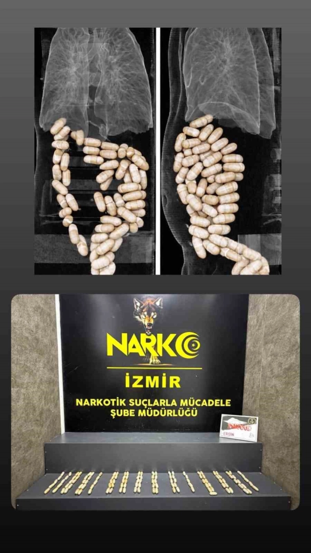 Narkotik Suçlarla Mücadele Şube Müdürlüğü ekipleri, yurt dışından kente yutmak suretiyle uyuşturucu madde getirileceği bilgisi üzerine çalışma başlattı. Harekete geçen ekipler, Adnan Menderes Havalimanı’nda tespit edilen şüphelileri takibe alarak operasyon düzenledi. Yakalanarak hastaneye sevk edilen şüpheliler üzerinde iç beden muayenesi yapıldı. Yapılan muayene sonucunda şahısların midesinde uyuşturucu madde tespit edildi. Gerçekleştirilen tıbbi müdahaleyle şüphelilerin midesinden 127 kapsül halinde yutulmuş toplam 1 kilo 304 gram eroin çıkarıldı. Operasyon kapsamında gözaltına alınan E.E. ve N.M. isimli şüpheliler, emniyetteki işlemlerinin ardından mahkemece tutuklanarak cezaevine gönderildi.