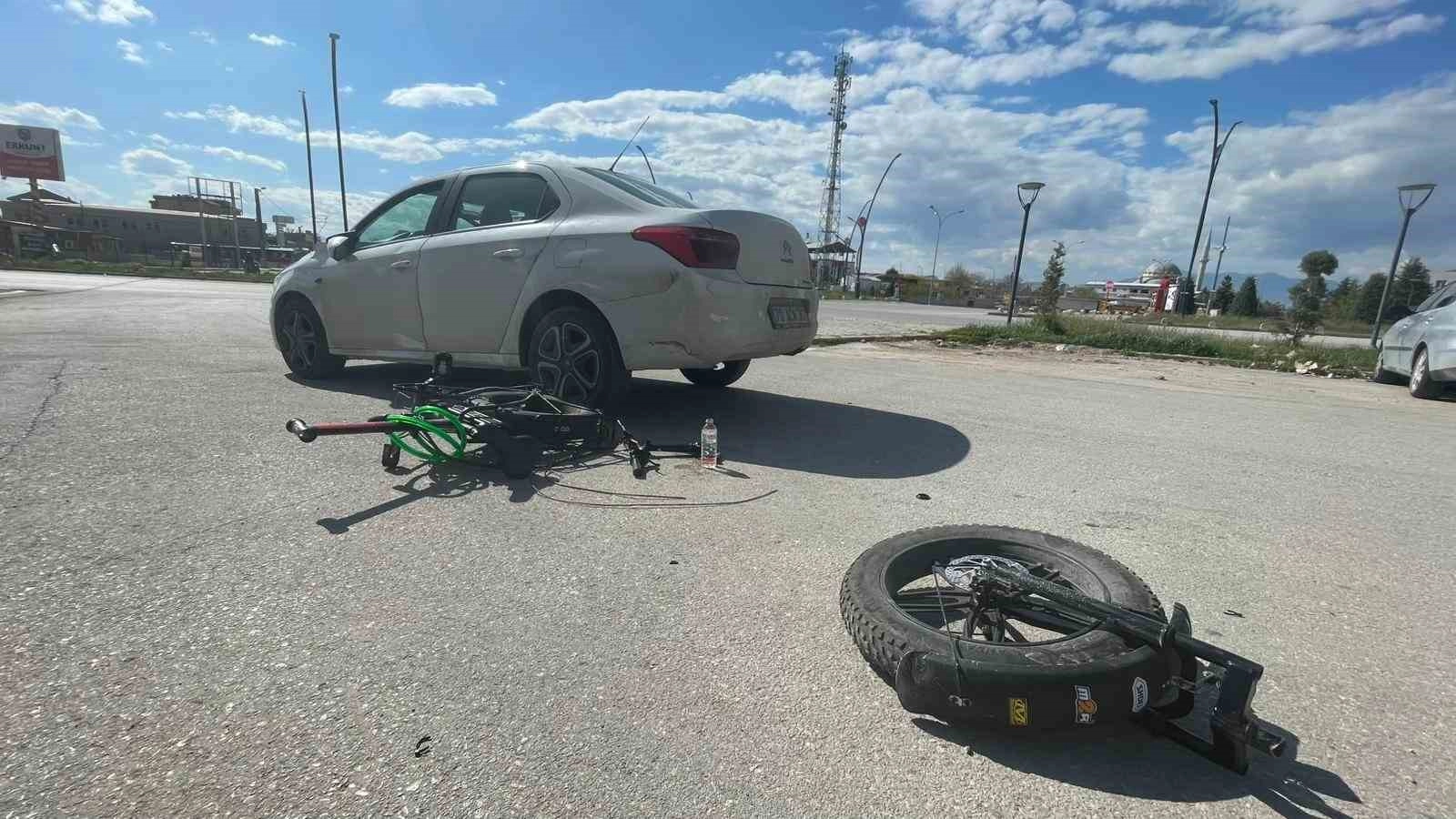 Karaman’da otomobil ile çarpışan elektrikli bisiklet ikiye bölünürken, 13 yaşındaki çocuk sürücü yaralandı.