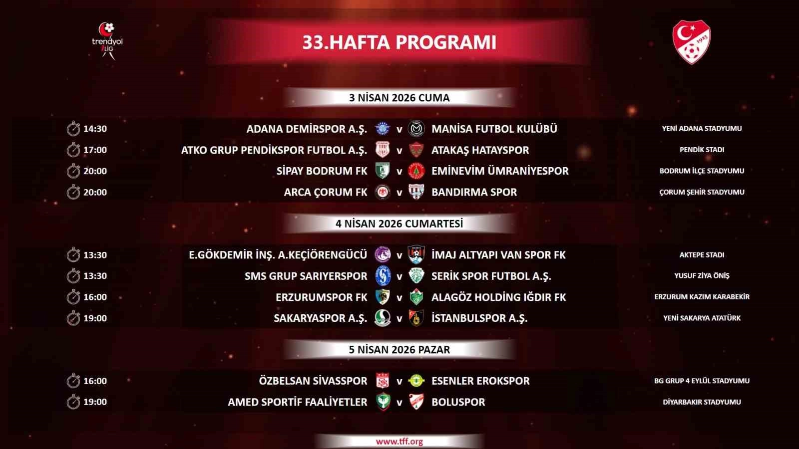Türkiye Futbol Federasyonu (TFF), Lig’in 33, 34 ve 35. hafta programlarını duyurdu. 33. hafta 3 Nisan Cuma,4 Nisan Cumartesi ve 5 Nisan Pazar günleri oynanacak. 34. hafta ise 7 Nisan Salı, 8 Nisan Çarşamba ve 9 Nisan Perşembe günü gerçekleşecek. Açıklanan takvimde 35. hafta, 11 Nisan Cumartesi, 12 Nisan Pazar ve 13 Nisan Pazartesi günü sahne alacak.