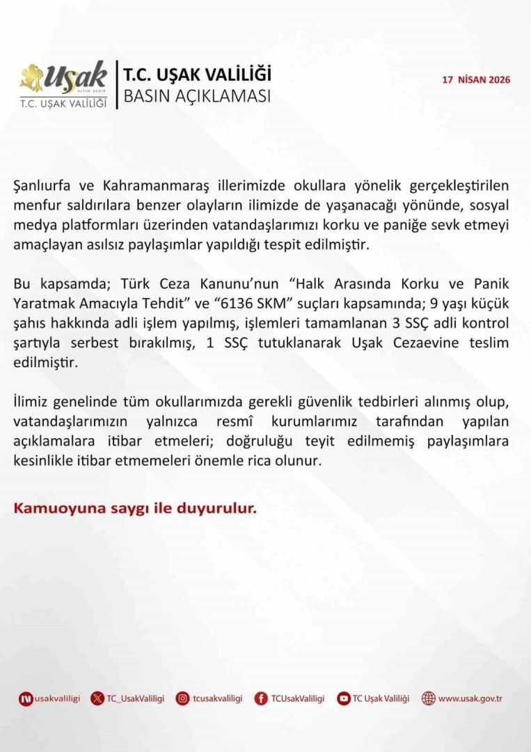Uşak Valiliği sosyal medya üzerinden yapılan yazılı açıklamada, Şanlıurfa ve Kahramanmaraş illerinde okullara yönelik gerçekleştirilen saldırılara benzer olayların Uşak’ta da yaşanacağı yönünde sosyal medya platformları üzerinden vatandaşları korku ve paniğe sevk etmeyi amaçlayan asılsız paylaşımların tespit edildiği bildirildi. Söz konusu paylaşımlar üzerine başlatılan çalışmalar kapsamında yaşı küçük 9 kişi hakkında adli işlem yapıldığı belirtilerek, işlemleri tamamlanan 3’ünün adli kontrol şartıyla serbest bırakıldığı, 1’inin ise tutuklanarak cezaevine teslim edildiği kaydedildi.