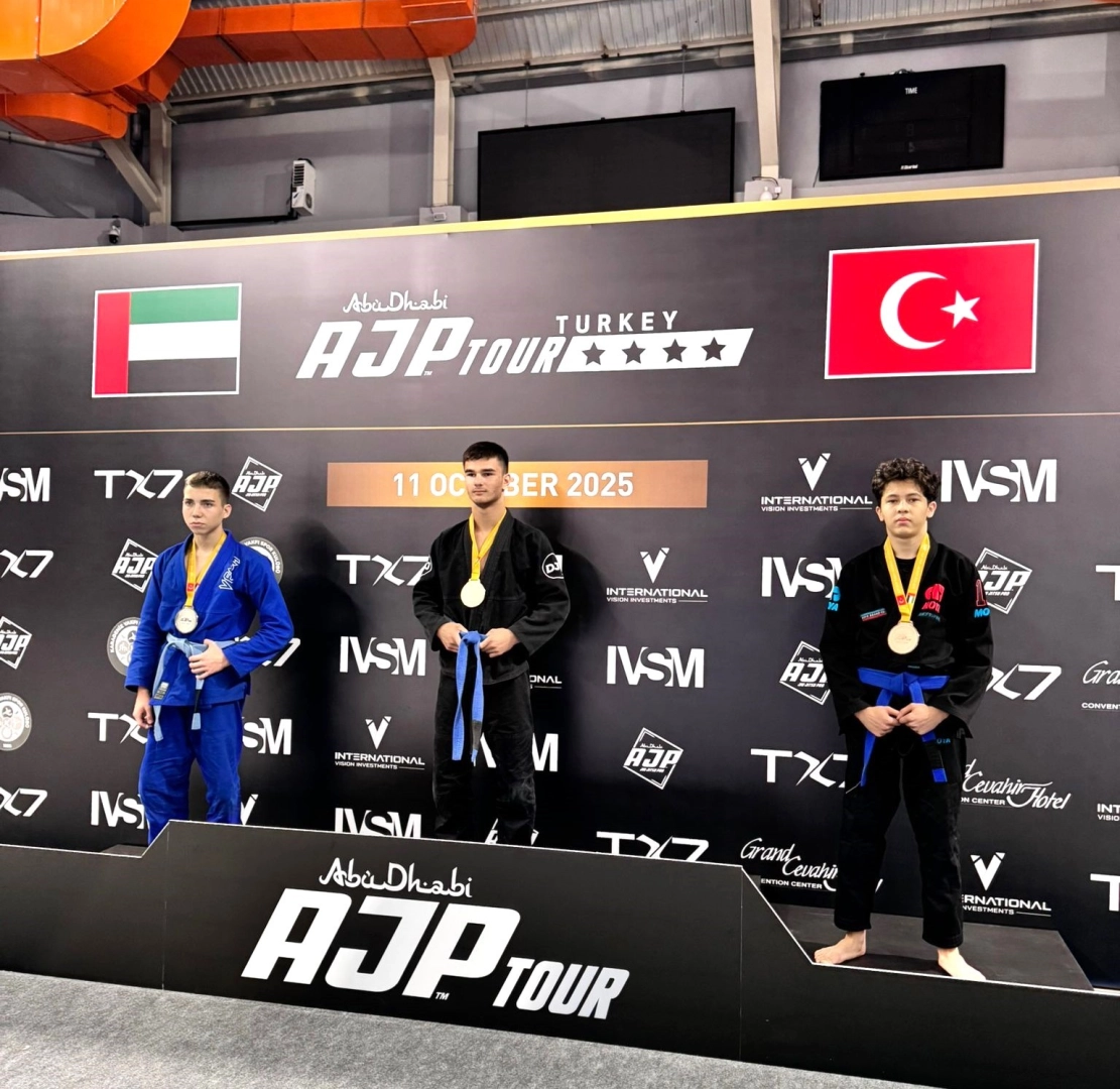 AJP Tour Turkey National Jiu-Jitsu Championship 2025’te mücadele eden 15 yaşındaki Yakın Doğu Spor Kulesi sporcusu Deniz Turan, 66 kilo genç erkekler kimonulu (Gi) kategorisinde altın madalya, kimonusuz (No-Gi) kategoride ise gümüş madalya kazandı.