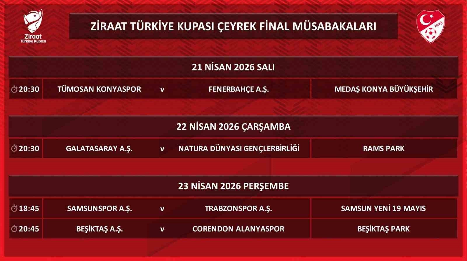 Türkiye Futbol Federasyonu’nun (TFF) internet sitesinden konuya ilişkin yapılan açıklamada, çeyrek final müsabakalarının 21, 22 ve 23 Nisan tarihlerinde oynanacağı belirtildi.