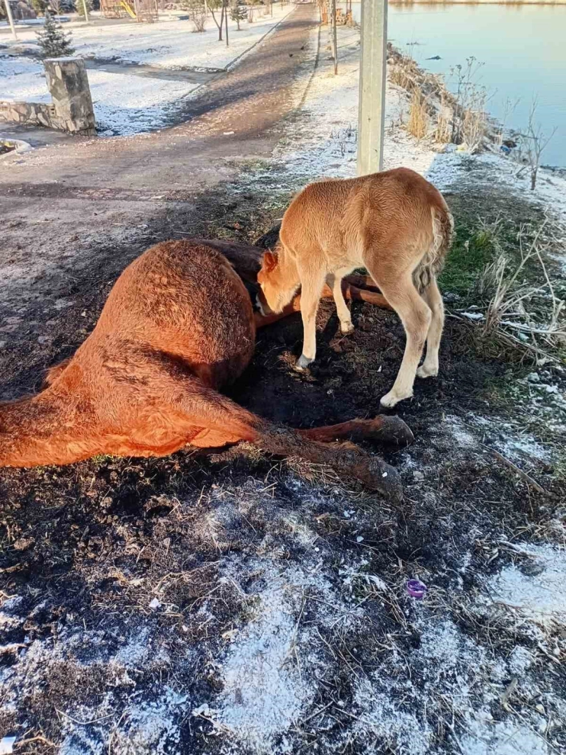 Zorlu hava şartlarının etkili olduğu bölgede bir kısrak hayatını kaybederken, geride kalan yavru tayın davranışı duygusal anlara sahne oldu.