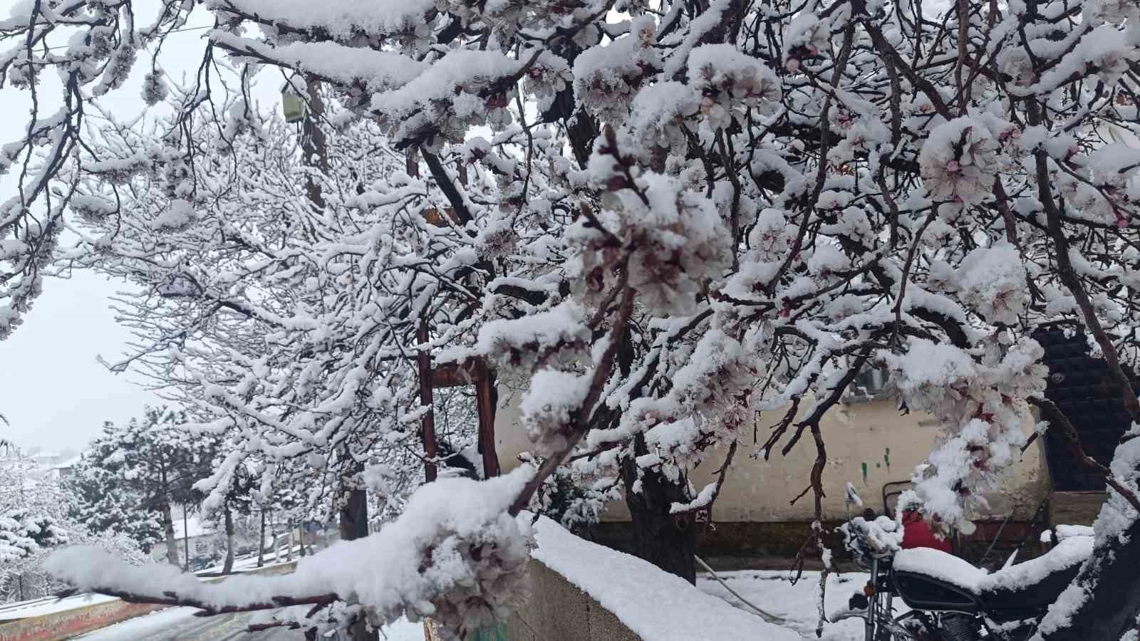 Yozgat’ta ilkbaharda çiçek açan ağaçlar, kentte etkili olan kar yağışıyla beyaza büründü.