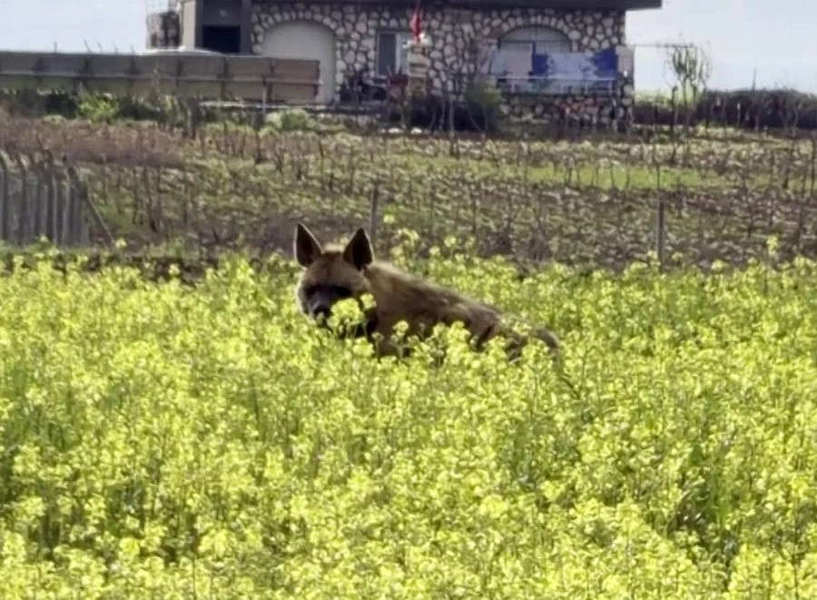 Adıyaman’ın Besni ilçesinde çizgili sırtlan sarı çiçeklerle kaplı tarlada yürürken görüntülendi.