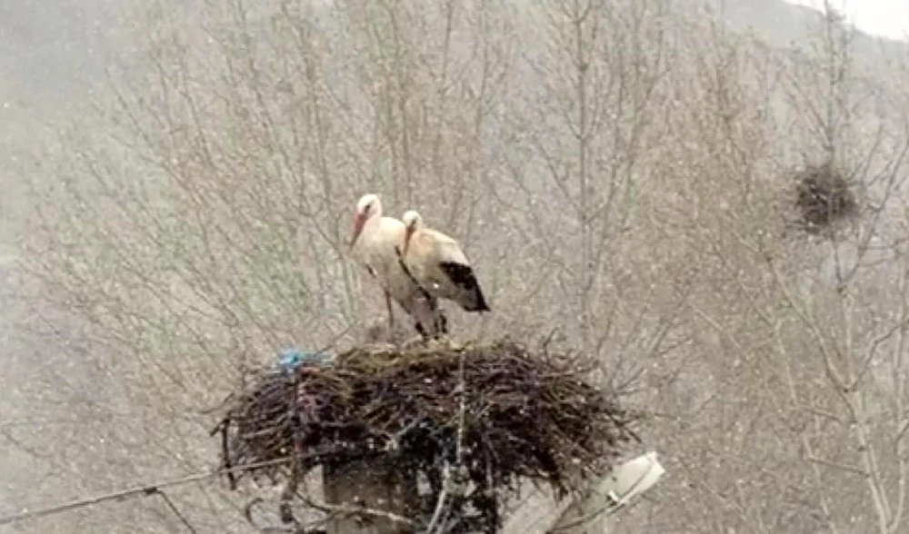 İlkbahar’ın gelişiyle birlikte Anadolu’ya göç eden leylekler, Sivas’ta kar sürprizi ile karşılaştı.