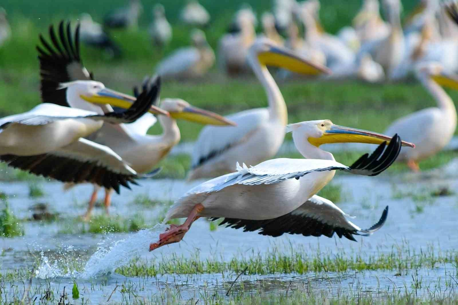 Göç yolundaki pelikan sürüsünün Bursa molası