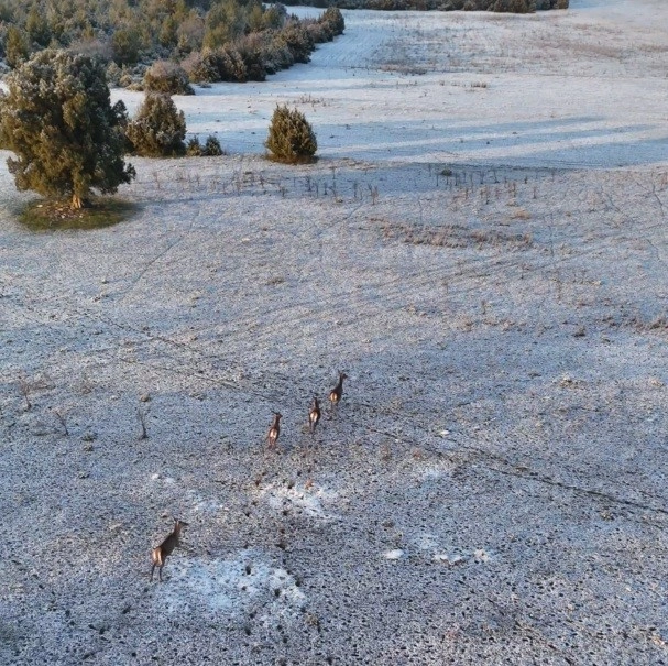 Mihalıççık ilçesi kırsal Çardak Köyü’nde doğa gezisi yapan ve dron ile karla kaplı dağları görüntülüyen Çağlar Memiş’in kadrajına 4 geyik takıldı. Karla kaplı tarım arazisinde koşuşturan geyiklerin özgürce koşusuna odaklanan Memiş, eşsiz manzaranın yanı sıra sevimli hayvanları da kaydetmiş oldu. Bir süre koşuşturan geyikler, ormanın derinliklerinde kayboldu.