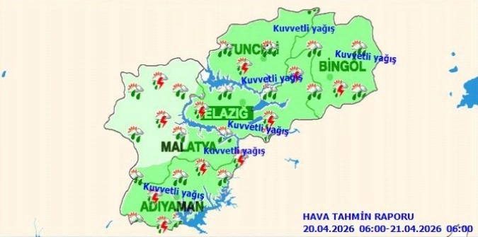 Bölge Müdürlüğü ekipleri tarafından yapılan açıklamada, "Bölgemiz genelinde havanın çok bulutlu ve gök gürültülü sağanak yağışlı geçeceği. Yağışların Elazığ, Adıyaman, Tunceli ve Bingöl’de kuvvetli olacağı tahmin edilmektedir. Hava sıcaklıklarının mevsim normalleri civarında seyredeceği, rüzgarın güney ve doğu yönlerden orta kuvvette yer yer kuvvetli, akşam saatlerinde ise kuzey ve batı yönlerden orta kuvvette eseceği tahmin edilmektedir. Bingöl ve Tunceli çevrelerinin yüksek kar örtüsüne sahip eğimli kesimlerinde çığ ve kar erimesi tehlikesi bulunduğundan meydana gelebilecek olumsuzluklara karşı dikkatli ve tedbirli olunması önem arz etmektedir" ifadeleri kullanıldı.