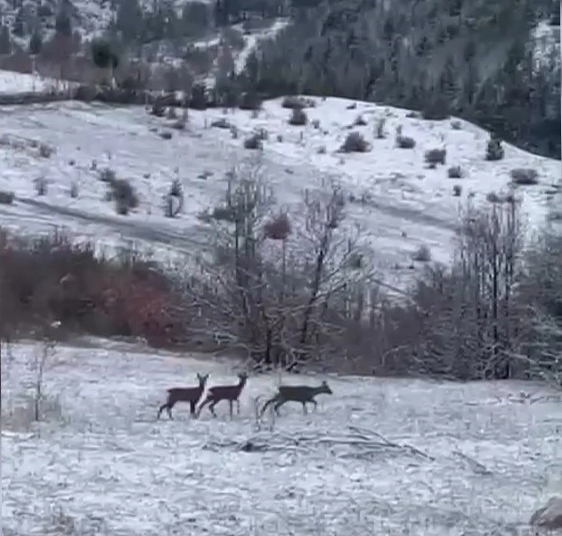 Kar yağışı altında doğada beslenen üç kızıl geyik, cep telefonu kamerasıyla görüntülendi.
