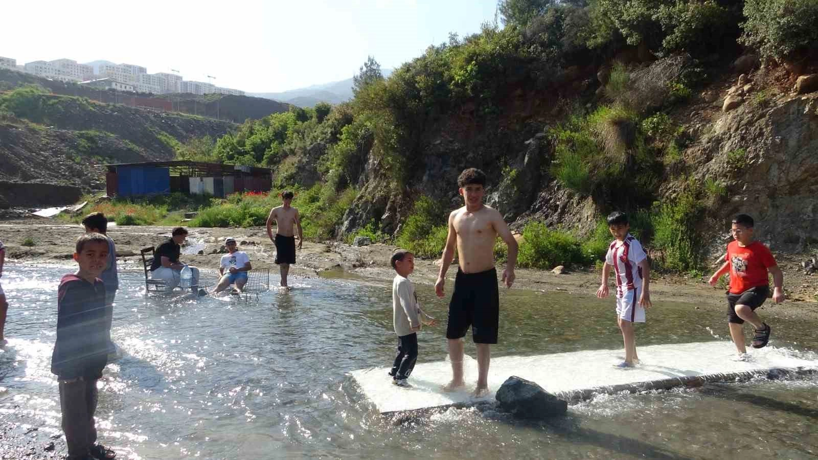 Hatay’da sıcak havadan bunalarak serinlemek isteyen çocuklar, derede yüzdüler.
