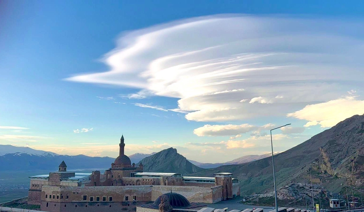 Ağrı’nın Doğubayazıt ilçesinde İshak Paşa Sarayı üzerinde oluşan mercek bulutları, gökyüzünde görsel şölen sundu.