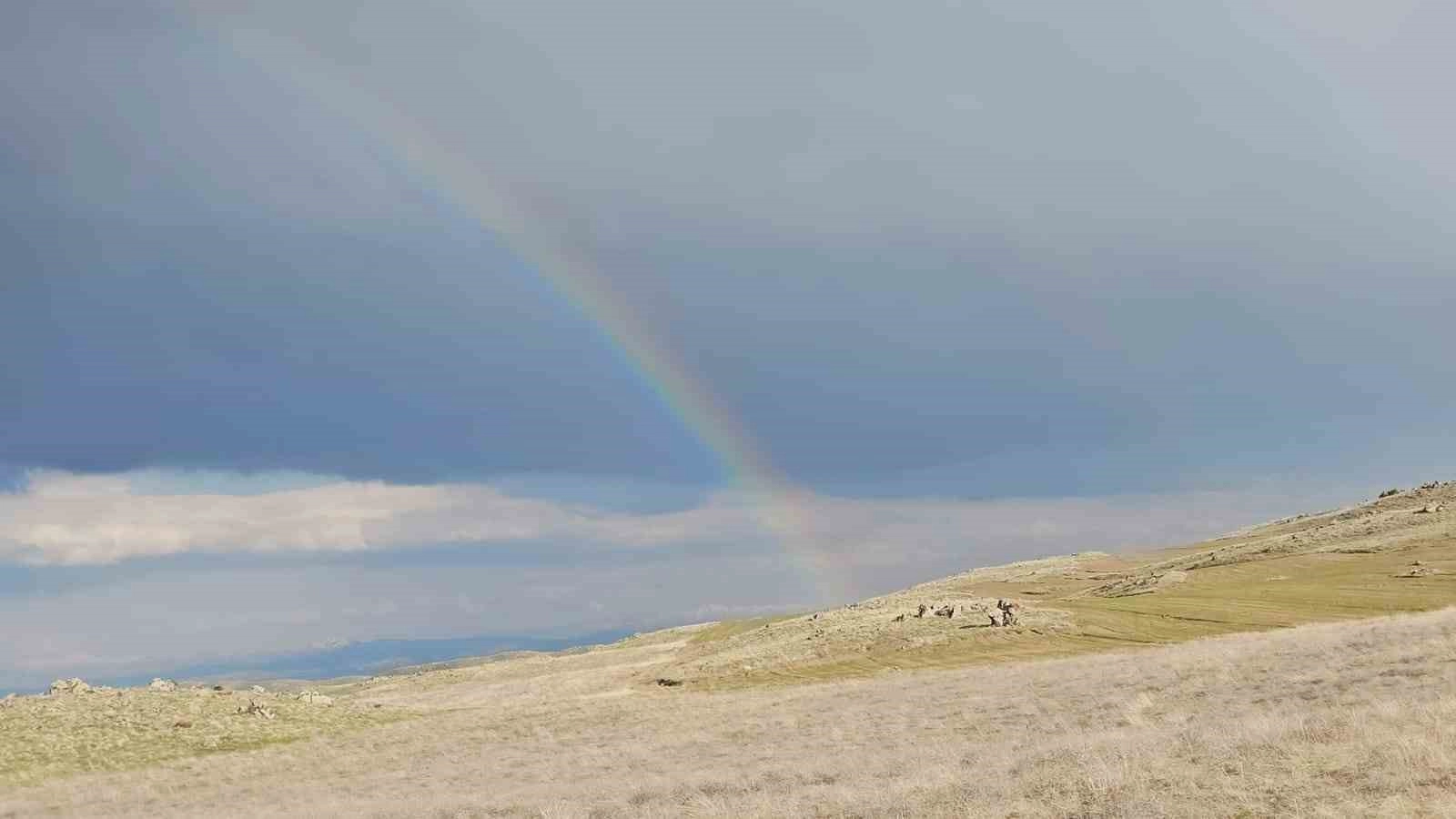 Bitlis’in Adilcevaz ilçesinde yağmursuz havada ortaya çıkan gökkuşağı hayran bıraktı.