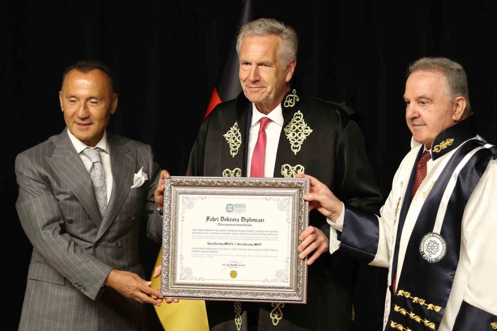 Almanya Federal Cumhuriyeti’nin 10. Cumhurbaşkanı Christian Wulff’a, Kocaeli Sağlık ve Teknoloji Üniversitesi tarafından düzenlenen törenle fahri doktora unvanı tevdi edildi. Törende konuşan Wulff, gençlere "köprü kurma" tavsiyesinde bulunarak, "Almanya’nın en ünlü anıtlarından biri olan Lübeck’teki Holstentor isimli kapıda ’Concordia domi et foris pax’ yazar. Bunun anlamı; ülke içerisinde birlik, dışarıda da barıştır. Bu sözleri orada okuyunca hemen aklıma Atatürk geliyor. Kendisinin ’Yurtta sulh, cihanda sulh’ sözlerini hatırlıyorum" dedi. Kocaeli Sağlık ve Teknoloji Üniversitesinde (KOSTÜ) düzenlenen fahri doktora tevdi törenine; Kocaeli Vali Yardımcısı Aslan Avşarbey, Dışişleri Bakanlığı Daire Başkanı Pınar Gülün Kayseri, Kocaeli Büyükşehir Belediyesi Başkan Vekili Berna Abiş, KOSTÜ Mütevelli Heyet Başkanı Dr. Talip Emiroğlu, Rektör Prof. Dr. Muzaffer Elmas, akademisyenler ve öğrenciler katıldı. Törende, Wulff’a verilen unvanın, Türkiye ile Almanya arasındaki köklü dostluğa, toplumlar arası diyaloğa ve barış kültürüne sunduğu katkıların bir göstergesi olduğu vurgulandı. Christian Wulff: "Lübeck’teki kapı yazısı bana Atatürk’ü hatırlatıyor" Törende katılımcılara hitap eden Christian Wulff, Türkiye ile Almanya arasındaki tarihi bağların dünyada eşine az rastlanır bir derinliğe sahip olduğunu belirterek, "Bana vermiş olduğunuz fahri doktora unvanı benim için gerçekten çok önemli" dedi. Günümüz dünyasında yaşanan krizlere, savaşlara ve gerilimlere dikkati çekerek gençlere seslenen Wulff, empati ve saygının önemini şöyle anlattı: "Benim yaşımdaki bir insanın gençlere bunları söylemesi belki farklı karşılanabilir ama benim sizlerden ricam köprüleri kurmanız; bizlerin iki ülke arasındaki kurmuş olduğumuz bağlantıları devam ettirmenizdir. Bazı insanlar duvar örmeye çalışıyorlar, biz sizlere ’Duvar örmeyin köprü kurun’ demek istiyoruz. Türkiye’de 50 bini aşkın Alman yaşıyor, Almanya’da da 3 milyonu aşkın Türk kökenli insanların yaşadığını biliyoruz. Evet, burada önemli olan vurgulamak istediğim, bu köprüler oluşurken birbirimize empati kurabilmemiz, saygıyla yaklaşabilmemizdir. Almanya’nın en ünlü anıtlarından biri olan Lübeck’teki Holstentor isimli kapıda ’Concordia domi et foris pax’ yazar. Bunun anlamı; ülke içerisinde birlik, dışarıda da barıştır. Bu sözleri orada okuyunca hemen aklıma Atatürk geliyor. Kendisinin ’Yurtta sulh, cihanda sulh’ sözlerini hatırlıyorum. Eğer bizler bu bağlamda birlikte çalışabilirsek, çocuklarımız da yarın barış içerisinde yaşayabilirler." Wulff ayrıca, yaşlanan toplumlarda sağlık ve teknoloji alanındaki çalışmaların kritik önem taşıdığını vurgulayarak, BioNTech aşısını bulan Uğur Şahin ve Özlem Türeci’nin başarılarını da Türk-Alman dayanışmasına örnek gösterdi. Muzaffer Elmas: "Yapay zeka destekli esnek eğitim modelimizle örnek bir kurum olma yolunda ilerliyoruz" KOSTÜ Rektörü Prof. Dr. Muzaffer Elmas ise üniversite olarak yapay zeka destekli esnek eğitim modeliyle Türkiye’de ve dünyada örnek bir kurum olma yolunda ilerlediklerini anlattı. Elmas, "Geliştirdiğimiz yapay zekayı üniversitenin derslerine monte ederek, yapay zeka destekli esnek eğitim modelimizle Türkiye’de ve dünyada örnek bir kurum olma yolunda ilerliyoruz. Eğitim-öğretimi yapay zeka desteğiyle sürekli güncel tutmaktayız. İkincisi, eğitim-öğretimi bilgi aktarmaktan çıkarıp öğretim üyelerinin sınıfta tartışma yaptığı, öğrencilerin muhakeme yeteneklerini geliştirdiği bir atmosfere dönüştürmek. Üçüncü özelliği ise öğrencilerin bireysel yeteneklerini yapay zekayla tespit edip ona göre ödevler, dersler ve bir öğrenme atmosferi oluşturmak. En sonunda ve en önemlisi de tüm eğitim-öğretimin temel direği olan bilgi, beceri ve yetkinlikleri mezunlara kazandırmayı doğrudan ölçebilen bir sistemimizin olmasıdır" dedi. "Wulff, büyük bir Türkiye dostudur" Wulff’un görev süresi boyunca sergilediği tutuma övgüde bulunan Elmas, şöyle konuştu: "2010 yılında Almanya Federal Cumhurbaşkanı olarak seçilen Sayın Wulff, kapsayıcı liderliği ile hafızalara kazınmıştır. Özellikle ’İslam, Almanya’nın bir parçasıdır’ ifadesi sadece bir siyasi söylem değil, toplumlar arası anlayışı güçlendiren tarihi bir duruş olarak tüm Avrupa’da yankı uyandırmıştır. Böylece Sayın Wulff’un bir devlet adamı olarak farklı inanç ve kültürlerin eşit bir toplumun doğal unsurları olduğu yönünde güçlü bir mesaj vermiştir. Sayın Wulff aynı zamanda büyük bir Türkiye dostudur. Türk-Alman dostluğuna yaptığı katkılar sadece siyasi düzeyde değil, toplumsal ve kültürel alanda da derin izler bırakmıştır. Onun çabaları iki ülke arasında karşılıklı anlayışın ve güvenin güçlenmesinde önemli katkı sağlamıştır. 2024 yılında DEİK bünyesinde Sayın Mehmet Ali Yalçındağ ve eski Federal Alman Milletvekili Sayın Özcan Mutlu’nun desteğiyle Türk-Alman Ekonomi Konseyi’nin kurulmasına öncülük etmesi ve kurucu başkanı olması, bu dostluğun ekonomik boyutta da güçlendirilmesine yönelik vizyonunun bir göstergesidir." Pınar Gülün Kayseri: "Almanya, Türkiye’nin Avrupa’daki en büyük ticari ortağıdır" Dışişleri Bakanlığı Daire Başkanı Pınar Gülün Kayseri de iki ülke ilişkilerinin 18. yüzyılın sonlarına dayandığını hatırlatarak, ekonomik ve toplumsal bağlara dikkati çekti. Kayseri, siyasi ve ekonomik belirsizliklerin arttığı günümüzde Türkiye-Almanya diyaloğunun daha da önem kazandığını belirterek, "Almanya ile ilişkilerimizin en önemli sütunlarından bir tanesi ekonomik ve ticari ilişkilerimizdir. Almanya ülkemizin