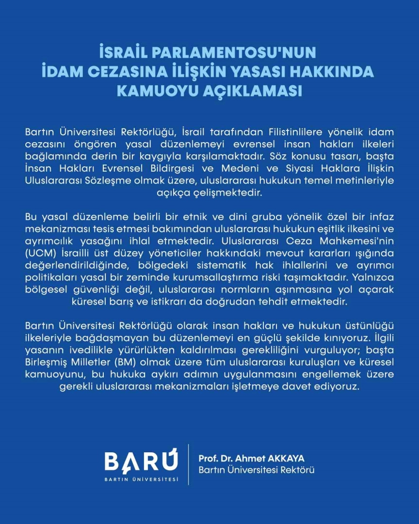 Bartın Üniversitesi Rektörlüğü olarak insan hakları ve hukukun üstünlüğü ilkeleriyle bağdaşmayan bu düzenlemeyi en güçlü şekilde kınıyoruz. İlgili yasanın ivedilikle yürürlükten kaldırılması gerekliliğini vurguluyor; başta Birleşmiş Milletler (BM) olmak üzere tüm uluslararası kuruluşları ve küresel kamuoyunu, bu hukuka aykırı adımın uygulanmasını engellemek üzere gerekli uluslararası mekanizmaları işletmeye davet ediyoruz" ifadeleri kullanıldı.