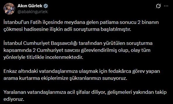 "Meydana gelen patlama sonucu 2 binanın çökmesi hadisesine ilişkin adli soruşturma başlatılmıştır. İstanbul Cumhuriyet Başsavcılığı tarafından yürütülen soruşturma kapsamında 2 Cumhuriyet savcısı görevlendirilmiş olup, olay tüm yönleriyle titizlikle incelenmektedir. Enkaz altındaki vatandaşlarımıza ulaşmak için fedakârca görev yapan arama kurtarma ekiplerimize şükranlarımızı sunuyoruz. Yaralanan vatandaşlarımıza acil şifalar diliyor, gelişmeleri yakından takip ediyoruz."