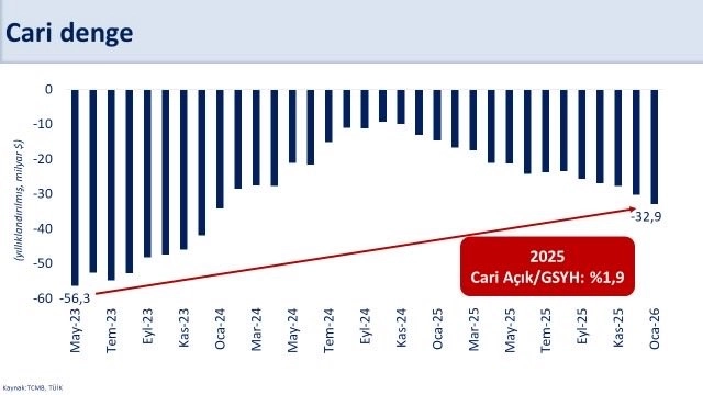 "Yıllık cari açık ocak ayında 32,9 milyar dolar oldu. Jeopolitik gerginliklerle artan enerji fiyatları nedeniyle 2026 yılında cari açık program öngörülerimizin üzerinde gerçekleşebilir. Güçlenen makroekonomik temellerimiz sayesinde bu artışın yönetilebilir olduğunu değerlendiriyoruz. Uyguladığımız programla dış finansman ihtiyacı ve borçluluk azalırken ekonomimizin şoklara karşı dayanıklılığı arttı. Brüt dış borç stokunun GSYH’ye oranı 2025’te yüzde 32,6’ya geriledi. Kırılganlıkları azaltan, yüksek katma değerli üretimi ve kalıcı refah artışını destekleyen politikalarımızı uygulamaya devam edeceğiz."