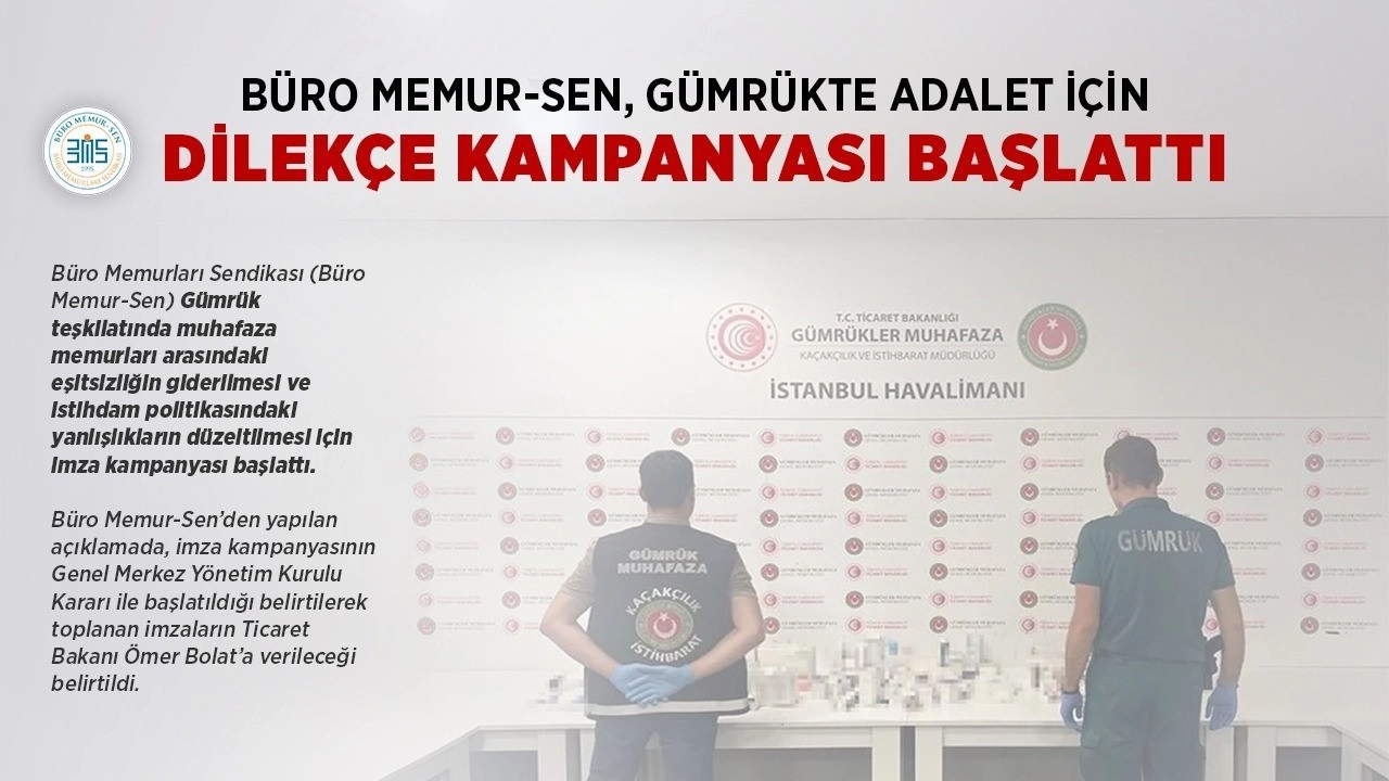 Büro Memurları Sendikası, (Büro Memur-Sen) gümrük teşkilatında muhafaza memurları arasındaki eşitsizliğin giderilmesi ve istihdam politikasındaki yanlışlıkların düzeltilmesi için imza kampanyası başlattı.