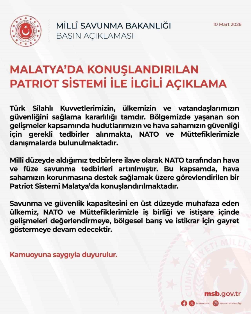 "Türk Silahlı Kuvvetlerimizin, ülkemizin ve vatandaşlarımızın güvenliğini sağlama kararlılığı tamdır. Bölgemizde yaşanan son gelişmeler kapsamında hudutlarımızın ve hava sahamızın güvenliği için gerekli tedbirler alınmakta, NATO ve müttefiklerimizle danışmalarda bulunulmaktadır. Milli düzeyde aldığımız tedbirlere ilave olarak NATO tarafından hava ve füze savunma tedbirleri artırılmıştır. Bu kapsamda, hava sahamızın korunmasına destek sağlamak üzere görevlendirilen bir Patriot sistemi Malatya’da konuşlandırılmaktadır. Savunma ve güvenlik kapasitesini en üst düzeyde muhafaza eden ülkemiz, NATO ve müttefiklerimizle iş birliği ve istişare içinde gelişmeleri değerlendirmeye, bölgesel barış ve istikrar için gayret göstermeye devam edecektir."