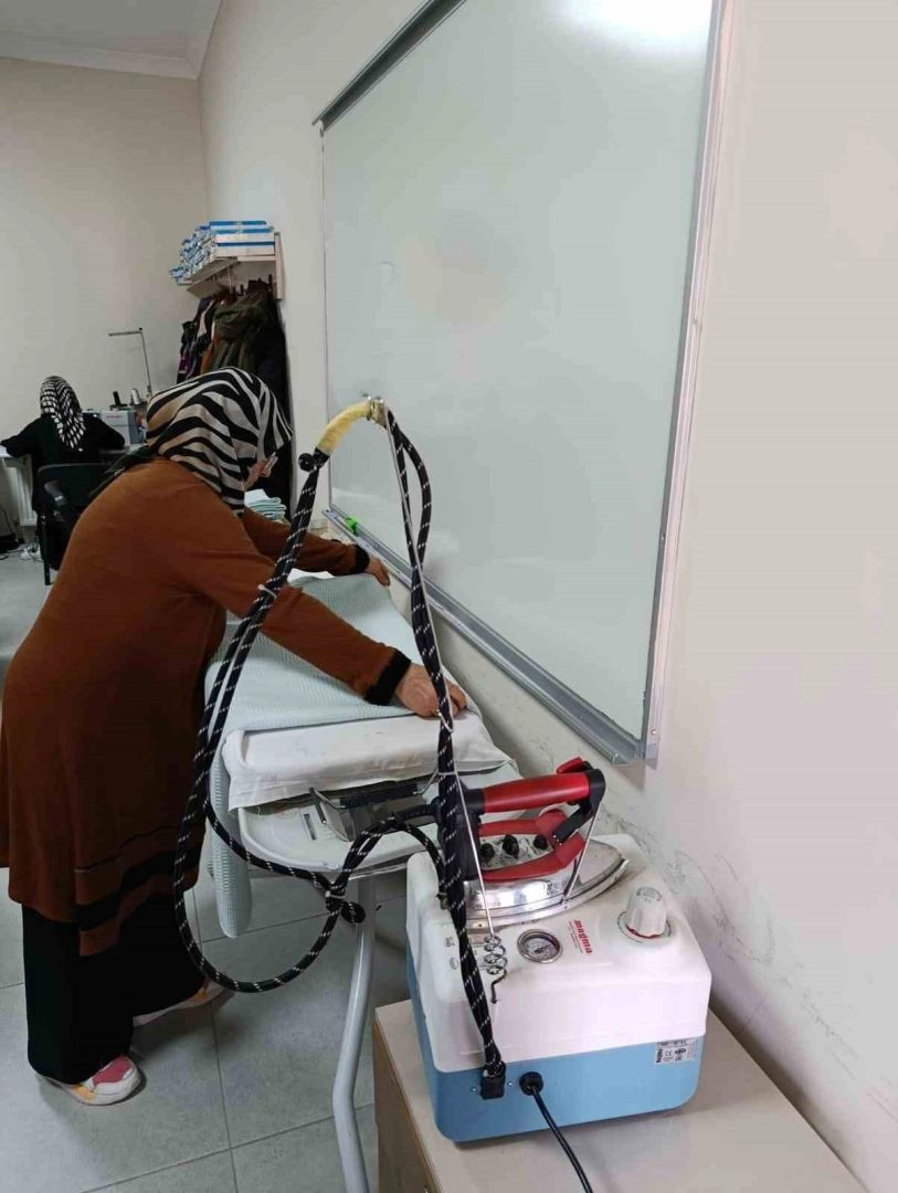 Kadınların meslek edinmesi, el becerilerini geliştirmesi ve ekonomik hayata katılımını desteklemek amacıyla açılan dikiş kursunda kursiyerler, nevresim ve pikeleri özenle hazırlayarak, ihtiyaç sahibi ailelere ulaştırmak üzere paketliyor.