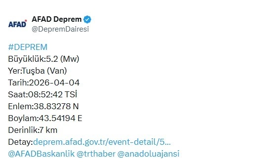 Afet ve Acil Durum Yönetimi Başkanlığı (AFAD), Van’da 5.2 büyüklüğünde deprem meydana geldiğini açıkladı.