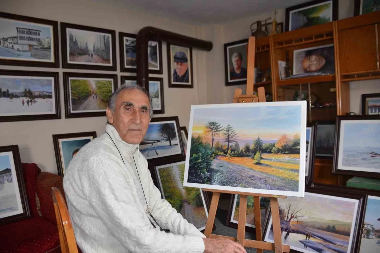 Çocukken yokluktan arkadaşlarından aldığı kağıt parçalarına resim yapan Necmi Öztürk’ün resim tuvali 55 yıldır en büyük tutkusu oldu. Bilecik’in Osmaneli ilçesinde emekli olduktan sonra 10 metrekare atölyede resim tuvaline hayat veren Necmi Öztürk, 55 yıldır resimlerini severek yapıyor. 72 yaşındaki Necmi Öztürk ilkokulun mezunu olduğunu ve hiçbir resim eğitimi almadığını anlatarak, "Ben ilkokulda resmi çok güzel yapıyordum ve daha sonra herkese resimler yapmaya başladım. Öğretmen tahtaya bir şey koyuyordu, bunun resmini yapın diyordu. Ben o zamandalar babamın iflasından dolayı resim defteri alacak durumum yoktu ve herkes bir sayfa veriyordu. Ben de onlara resim yapıyordum. Sonra öğretmenlerim ilçemize İstanbul’dan üniversiteden gelen akademisyenlere beni anlattı. Resimlerimi görünce çok beğendiler ve beni İstanbul’a götürdüler. Orada bir ressamın yanında çalışmaya başladım. Gittiğimiz arkadaş asistandı, daha sonra hocam doçent oldu, profesör oldu. Onun yanında yıllarca çalıştım. Emekli olunca, kendisi vefat edince, Osmaneli’ne tekrar geri döndüm, atölye açtım" dedi. "Ortaokulu babamın iflasından dolayı yarım bıraktım" Necmi Öztürk, 55 yıldır resim yaptığını anlatarak, "Eğitimim yok, ilkokul mezunuyum ortaokulu babamın iflasından dolayı yarım bıraktım. Burada, Osmaneli’nde dışarılara pek gidemedim, ve resim sergisi açamadım. Burada 4-5 tane sergim oldu, festivallere gittik. Burada böyle hobi olarak resim yapıyorum. Birileri portre istiyor, portre yapıyorum böyle geçiyor zaman" diye konuştu.