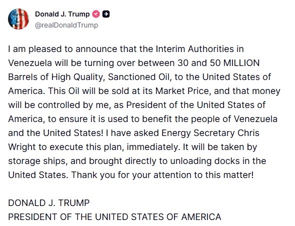 ABD’nin Venezuela’ya saldırı düzenleyerek ülkenin devlet başkanı Nicolas Maduro ve eşi Cilia Flores’i kaçırmasının yankıları sürerken, ABD Başkanı Trump’tan Maduro sonrası Venezuela ile ilgili dikkat çeken bir açıklama geldi. Trump, sahibi olduğu Truth sosyal medya platformu üzerinden yaptığı paylaşımda, Venezuela’daki geçici yönetimin yaptırım altındaki 30 ila 50 milyon varil arasında yüksek kaliteli petrolü ABD’ye devredeceğini duyurdu. Bu petrolün piyasa fiyatından satılacağını belirten Trump, "Elde edilecek gelir, hem Venezuela hem de ABD halkının yararına kullanılmasını sağlamak amacıyla ABD Başkanı olarak benim kontrolümde olacak" ifadelerini kullandı. ABD Enerji Bakanı Chris Wright’tan bu planı derhal hayata geçirmesini istediğini aktaran Trump, "Bu petrol, depolama gemileriyle alınacak ve doğrudan ABD boşaltma rıhtımlarına getirilecek" dedi.