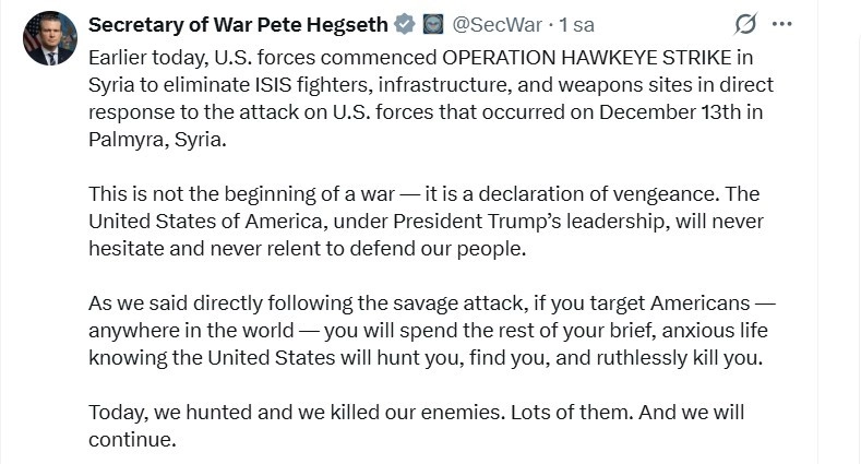 ABD Savunma Bakanı Pete Hegseth ise, sosyal medya platformu X üzerinden yaptığı açıklamada ABD’nin bugün erken saatlerde Suriye’de "Hawkeye Strike Operasyonu"nu (Şahin Gözü Operasyonu) başlattığını duyurdu. Bu operasyonun 13 Aralık’ta Suriye’nin Tedmur (Palmira) bölgesinde ABD güçlerine yönelik gerçekleştirilen saldırıya doğrudan bir yanıt olduğunun altını çizen Hegseth, "Operasyon, DEAŞ savaşçılarını, altyapısını ve silah mevzilerini ortadan kaldırmayı amaçlamaktadır" dedi. Bu operasyonun bir savaş başlangıcı değil, intikam ilanı olduğunu kaydeden Hegseth, "Başkan Trump’ın liderliği altındaki ABD, halkını savunma konusunda asla tereddüt etmeyecek ve asla geri adım atmayacaktır" ifadelerini kullandı. ABD’yi ve halkını hedef alan herkesin dünyanın neresinde olursa olsun bulunup yok edileceğini vurgulayan Hegseth, "Bugün düşmanlarımızı avladık ve öldürdük. Hem de çok sayıda. Ve buna devam edeceğiz" dedi.