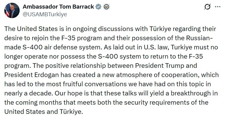 ABD’nin Ankara Büyükelçisi ve Suriye Özel Temsilcisi Tom Barrack, sosyal medya platformu X üzerinden yaptığı paylaşımda, Türkiye’nin F-35 programına geri dönüşü konusunda yürütülen müzakerelere ilişkin açıklamalarda bulundu. Türkiye ile görüşmelerin sürdüğünü ifade eden Barrack, "ABD yasalarına göre, Türkiye’nin F-35 programına geri dönmesi için S-400 sistemlerini kullanmaması ve bulundurmaması gerekiyor" ifadelerini kullandı.