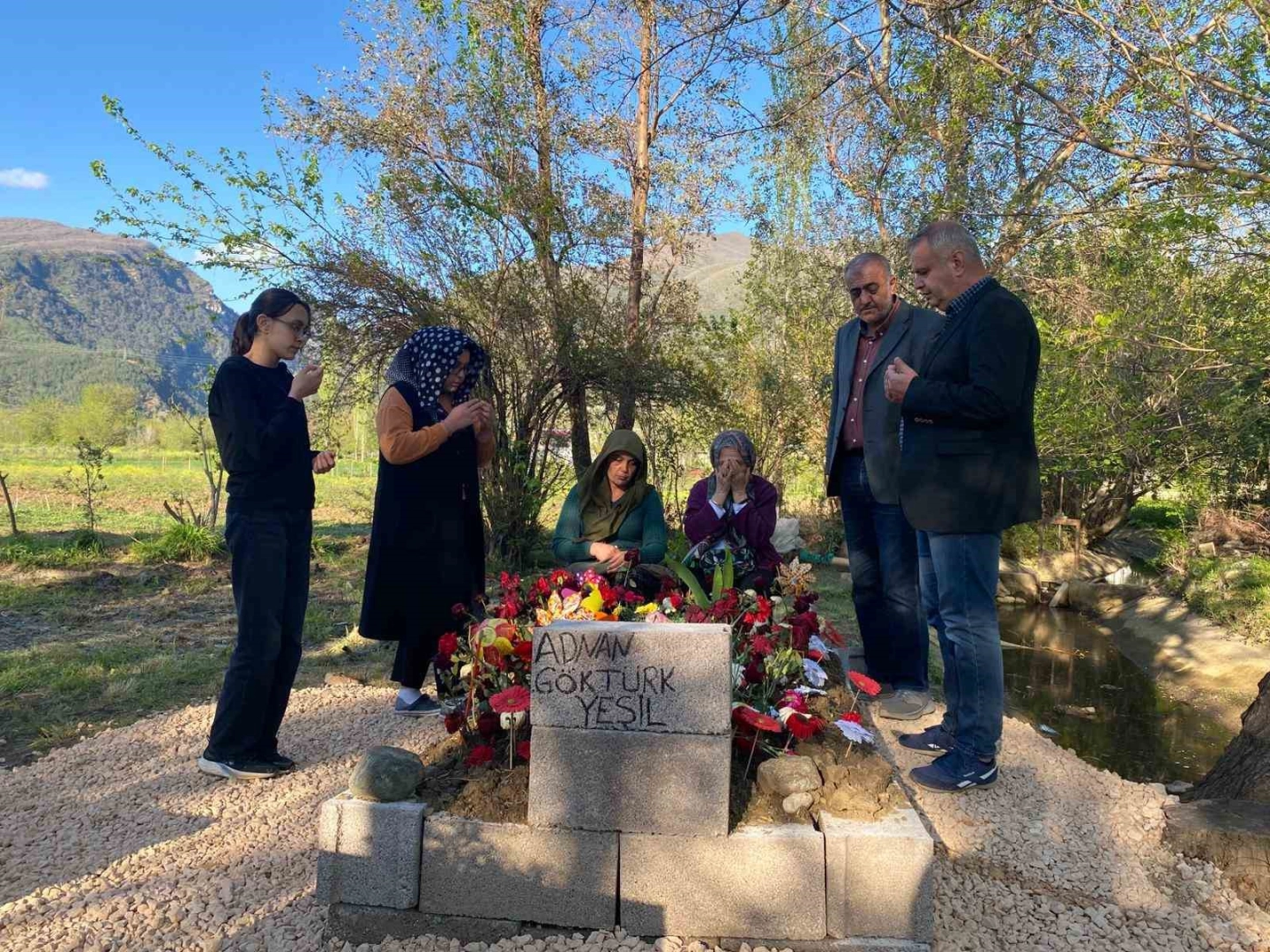 Düziçi ilçesindeki Yeşil Mezarlığı’nda bulunan Adnan’ın kabrini ziyaret eden ailesi, arkadaşları ve vatandaşlar çiçekler bırakıp dualar ediyor.