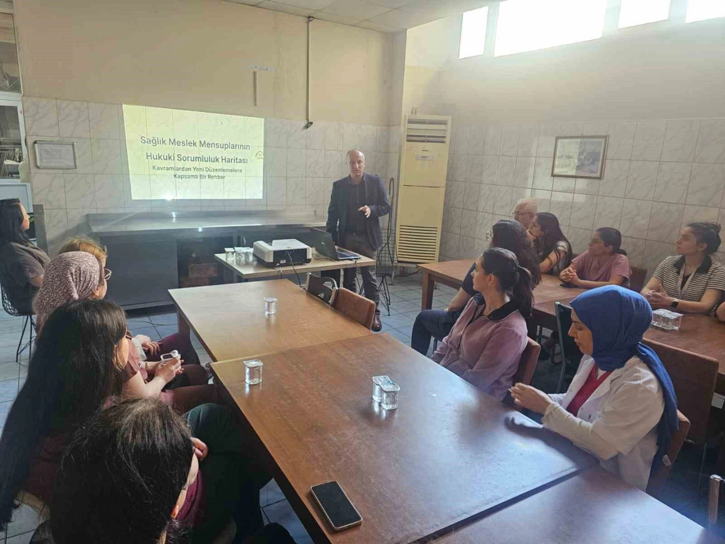 Aydın İl Sağlık Müdürlüğü Hukuk ve Muhakemat biriminde görevli avukatlar ile Mesleki Sorumluluk Kurulu İl Koordinatörü tarafından verilen eğitimde, sağlık çalışanlarının mesleki sorumlulukları ve hukuki süreçlerde izlenecek yollar detaylı şekilde ele alındı. Eğitim kapsamında, özellikle rücu işleyişi, idari ve hukuki sorumluluklar ile sağlık çalışanlarının görevlerini yerine getirirken dikkat etmesi gereken hususlar hakkında bilgilendirme yapıldı. Katılımcılara, karşılaşılabilecek hukuki durumlarda izlenecek prosedürler örnekler üzerinden anlatıldı.