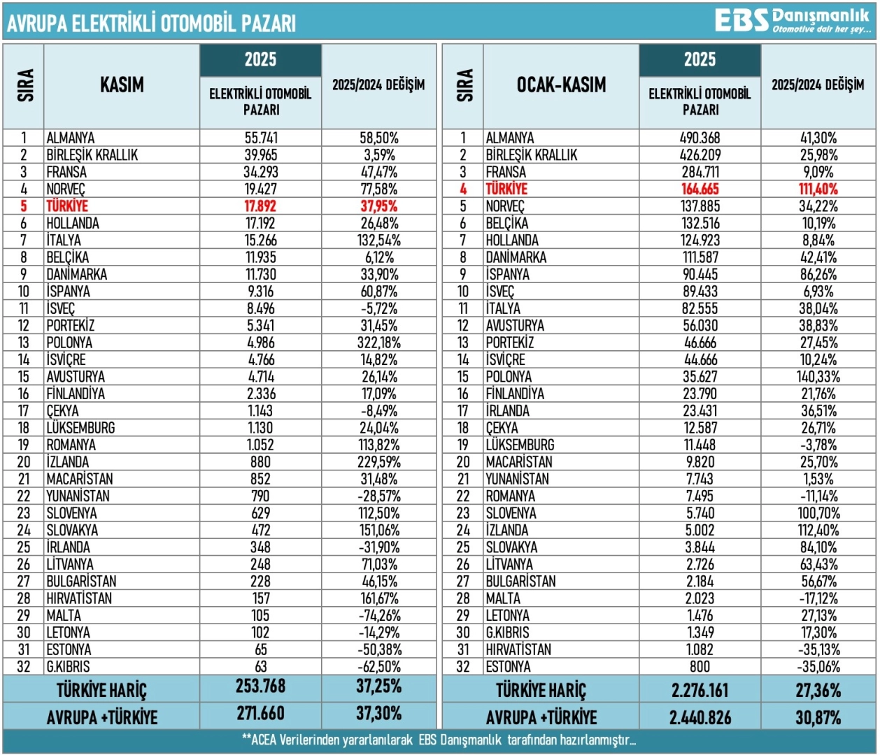 Kasım ayı satışlarında ise Türkiye, 17 bin 892 adet elektrikli otomobil satışı ile Avrupa 5. sırada yer aldı. Kasım ayındaki yıllık artış oranı yüzde 37,95 olarak kaydedildi. Elektrikli otomobillerin toplam otomobil satışları içindeki payına bakıldığında Türkiye’de Ocak-Kasım döneminde pazar payı yüzde 17,55 olarak tespit edildi. Bu oranla Türkiye, Avrupa’daki 32 ülke arasında 17. sırada konumlandı. Avrupa ortalaması ise yüzde 18,81 seviyesinde gerçekleşti. Türkiye’de 2026 yılında elektrikli araç tercihinin yüzde 20’lerin üzerine çıkması bekleniyor.