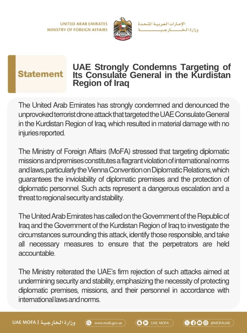 Irak hükümeti ve Kürt Bölgesel Yönetimi’ne saldırıyı soruşturma, faillerin hesap vermesini sağlama ve gerekli tüm önlemleri alma çağrısı yapıldı. BAE’nin güvenlik ve istikrarı baltalamayı amaçlayan bu tür saldırıları kesin bir dille reddettiğini yinelenerek, diplomatik misyonların ve personelin uluslararası hukuk ve normlara uygun şekilde korunması gerektiği vurgulandı.