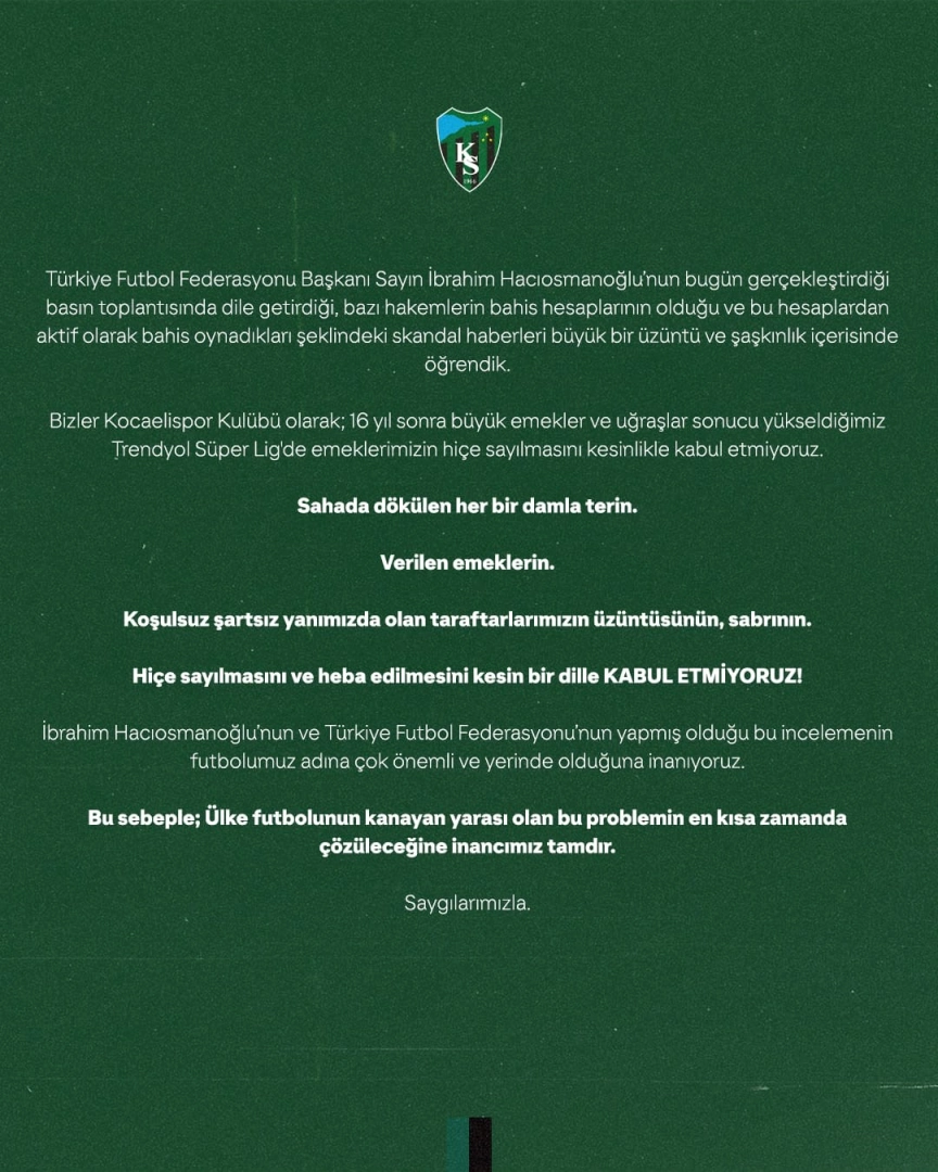 "Türkiye Futbol Federasyonu Başkanı İbrahim Hacıosmanoğlu’nun bugün gerçekleştirdiği basın toplantısında dile getirdiği, bazı hakemlerin bahis hesaplarının olduğu ve bu hesaplardan aktif olarak bahis oynadıkları şeklindeki skandal haberleri büyük bir üzüntü ve şaşkınlık içerisinde öğrendik. Bizler Kocaelispor Kulübü olarak 16 yıl sonra büyük emekler ve uğraşlar sonucu yükseldiğimiz Trendyol Süper Lig’de emeklerimizin hiçe sayılmasını kesinlikle kabul etmiyoruz.