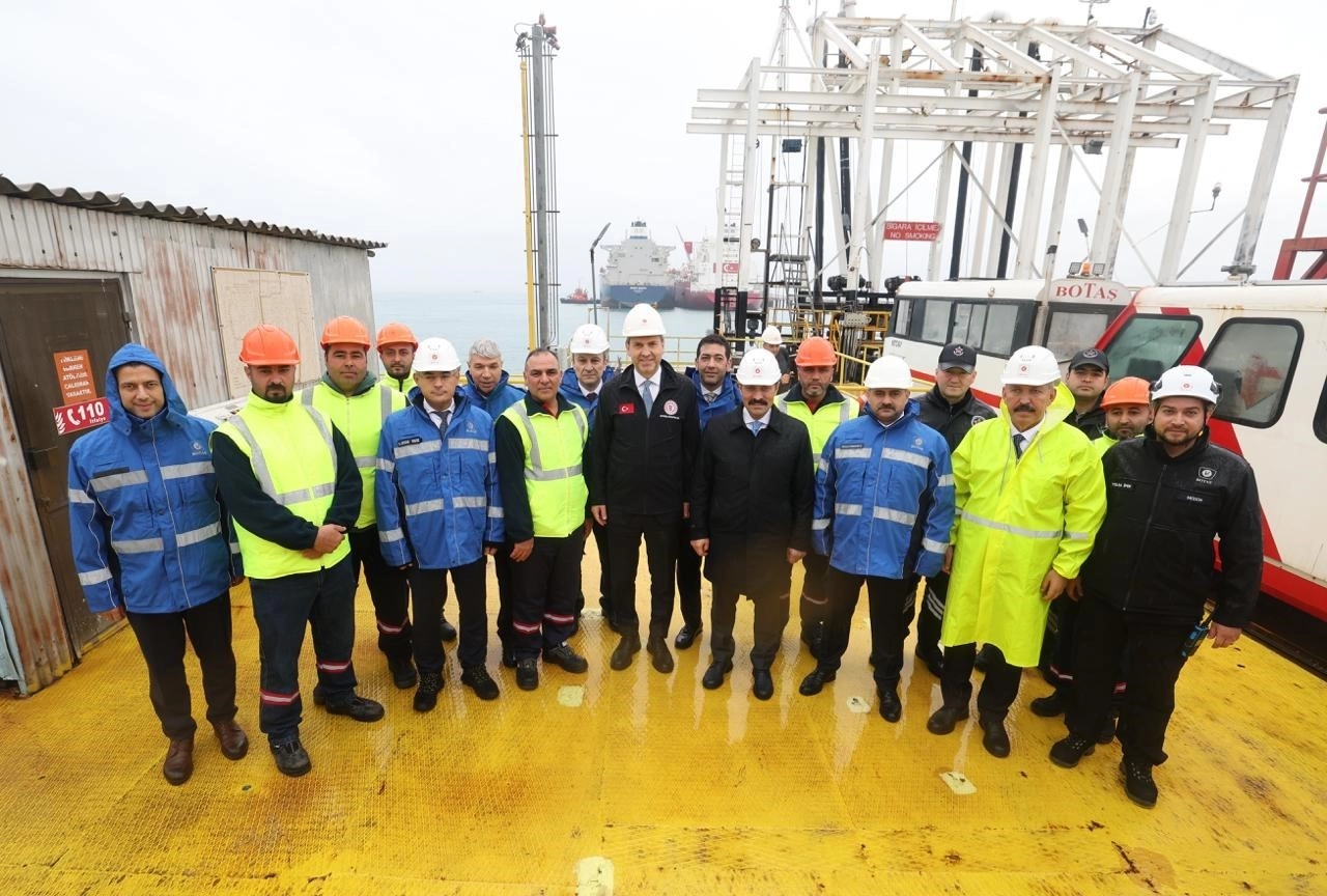 Türkiye’nin ilk yerli ve milli FSRU gemisi Ertuğrul Gazi’nin de bulunduğu BOTAŞ Dörtyol FSRU Tesisinde gazetecilerle bir araya gelen Bakan Bayraktar, tesisteki 139’uncu gemiden gemiye transfer (ship-to-ship) operasyonunu takip etti.