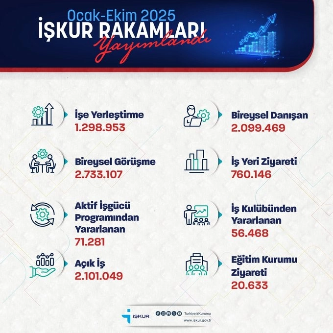 "Bu amaçla ocak-ekim ayları arasında önemli adımlar attık. 1 milyon 298 bin 953 işe yerleştirmeye aracılık ettik. 2 milyon 733 bin 107 bireysel görüşme ve 760 bin 146 iş yeri ziyareti gerçekleştirdik. Tüm bu süreçte toplam 2 milyon 101 bin 49 açık iş (işveren tarafından talep edilen-ihtiyaç duyulan eleman) tespit ettik. Ülkemizin kalkınmasına katma değer sağlayan her bir vatandaşımızın yanında olmaya devam edeceğiz."