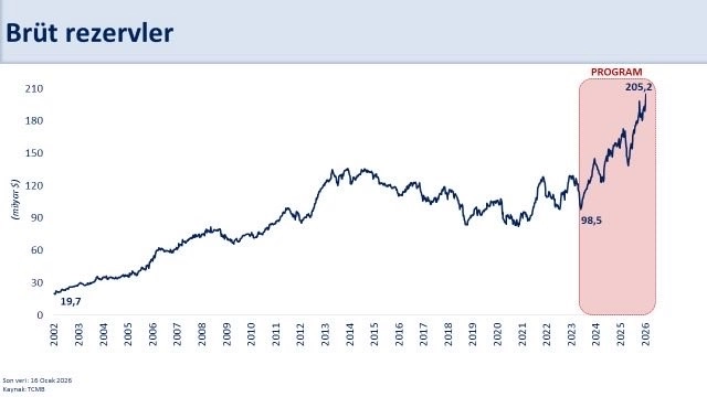"Rezervlerimiz tarihi zirvesinde. Uyguladığımız program sayesinde brüt rezervler yaklaşık 107 milyar dolar artarak 205,2 milyar dolara ulaştı. Swap hariç net rezervlerdeki artış ise 139,3 milyar dolar oldu. Uluslararası standartlara göre rezerv yeterliliğini sağladık. Aynı zamanda, önemli bir şartlı yükümlülük olan 143 milyar dolar tutarındaki KKM’den çıkış sürecini de başarıyla tamamlıyoruz. Böylece döviz pozisyonunda toplam 280 milyar doları aşan iyileşme gerçekleşti. Güçlenen makro finansal istikrar, risk primimizin azalmasına ve ekonomimizin şoklara karşı daha dayanıklı hale gelmesine önemli katkı sağlıyor."