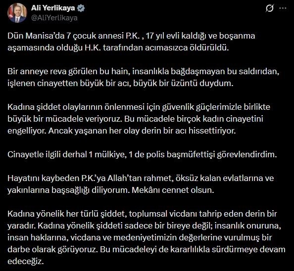 İçişleri Bakanı Yerlikaya, sosyal medya hesabından Manisa’da 7 çocuk annesi P.K.’nın 17 yıl evli kaldığı ve boşanma aşamasında olduğu H.K. tarafından öldürülmesine ilişkin yaptığı açıklamada, "Bir anneye reva görülen bu hain, insanlıkla bağdaşmayan bu saldırıdan, işlenen cinayetten büyük bir acı, büyük bir üzüntü duydum. Kadına şiddet olaylarının önlenmesi için güvenlik güçlerimizle birlikte büyük bir mücadele veriyoruz. Bu mücadele birçok kadın cinayetini engelliyor. Ancak yaşanan her olay derin bir acı hissettiriyor. Cinayetle ilgili derhal 1 mülkiye, 1 de polis başmüfettişi görevlendirdim. Hayatını kaybeden P.K.’ya Allah’tan rahmet, öksüz kalan evlatlarına ve yakınlarına başsağlığı diliyorum. Mekânı cennet olsun. Kadına yönelik her türlü şiddet, toplumsal vicdanı tahrip eden derin bir yaradır. Kadına yönelik şiddeti sadece bir bireye değil; insanlık onuruna, insan haklarına, vicdana ve medeniyetimizin değerlerine vurulmuş bir darbe olarak görüyoruz. Bu mücadeleyi de kararlılıkla sürdürmeye devam edeceğiz" dedi.