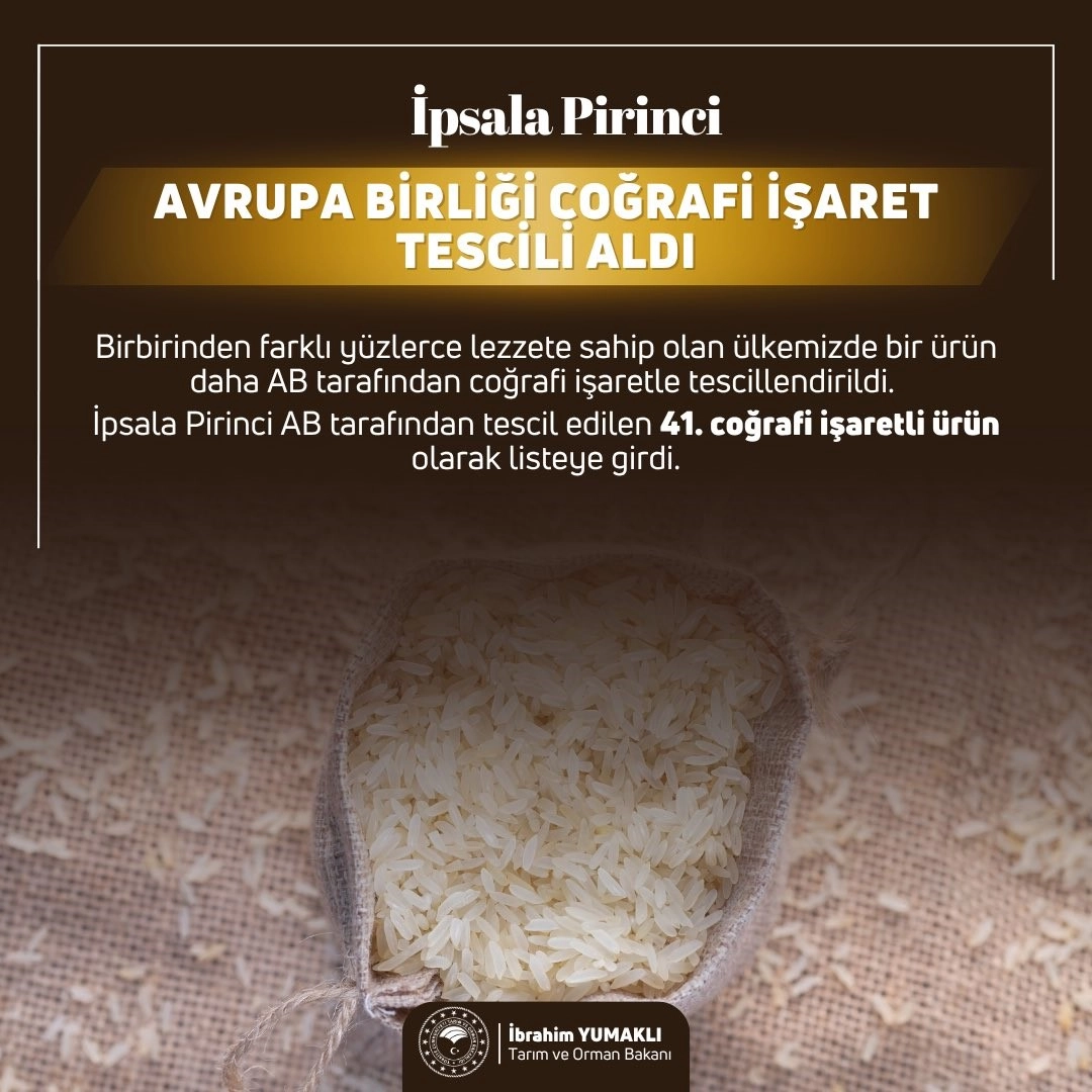 Tarım ve Orman Bakanı İbrahim Yumaklı, "Bursa Kestane Şekeri ve İpsala Pirinci’nin Avrupa Birliği’nden (AB) coğrafi işaret tescili almasıyla, tescilli ürün sayımız 42’ye yükseldi" dedi.