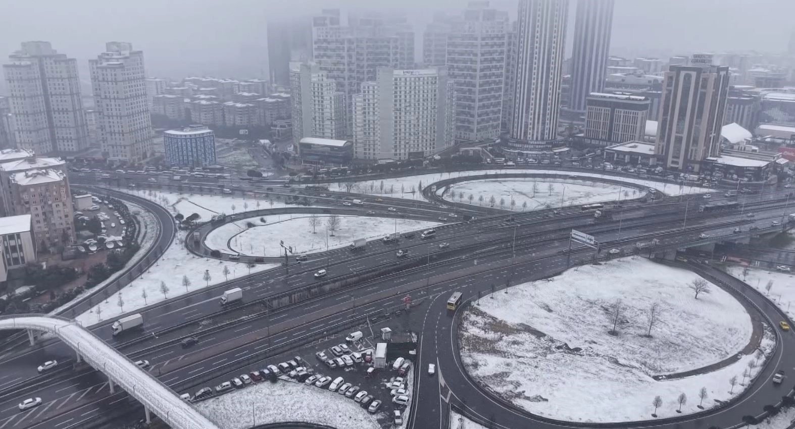 İstanbul’da aralıkla süren kar yağışı özellikle yüksek kesimlerde tuttu. Bazı ilçelerde kar kalınlığı artarken, Esenyurt ise kısmen beyaza büründü. Yağışın sürdüğü Esenyurt dronla görüntülendi.