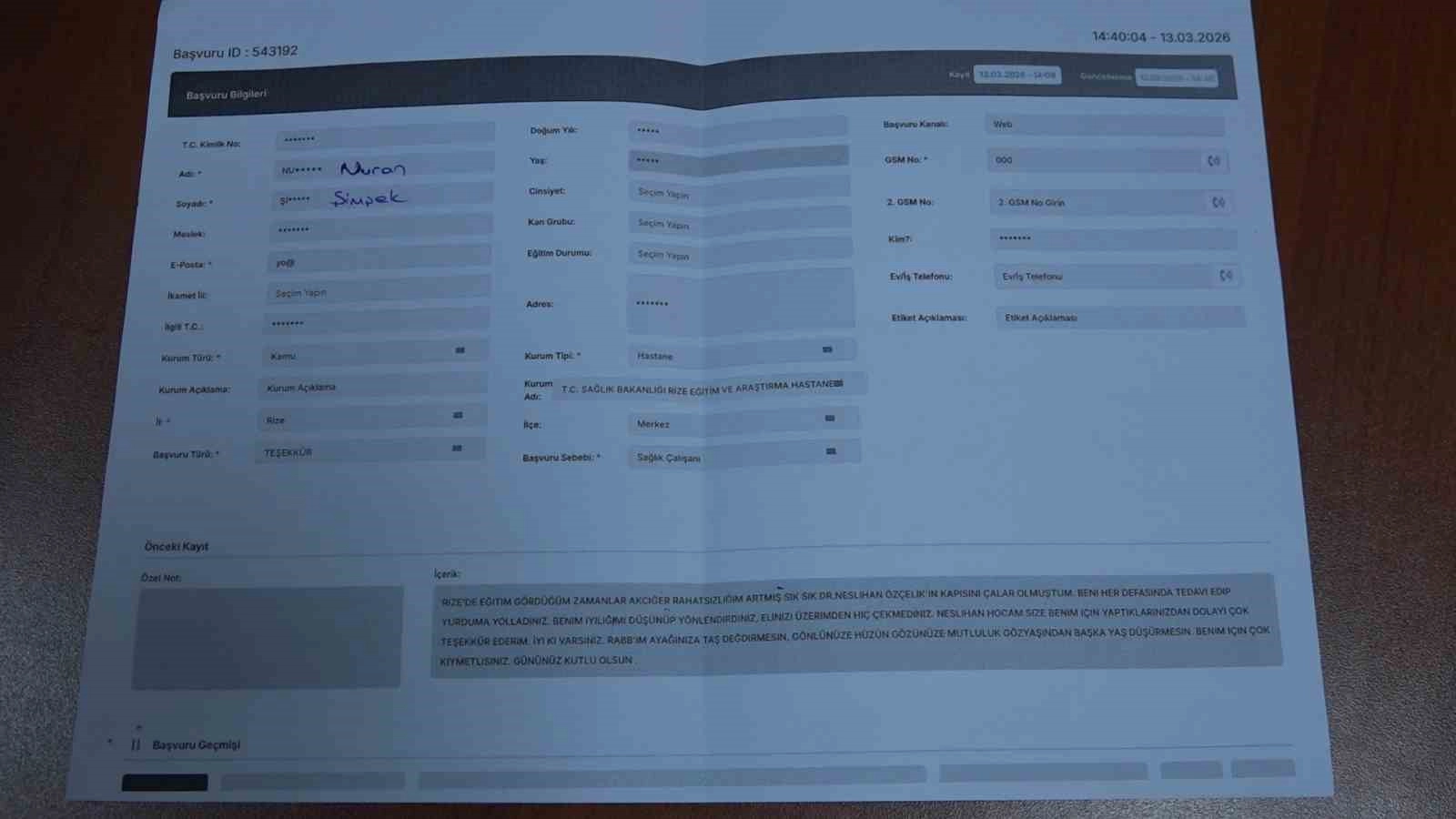 CİMER’e yazdığı mesajda duygularını samimi ifadelerle aktaran Şimşek, "Rize’de eğitim gördüğüm zamanlar akciğer rahatsızlığım artmış, sık sık Dr. Neslihan Özçelik’in kapısını çalar olmuştum. Beni her defasında tedavi edip yurduma yolladınız. Benim iyiliğimi düşünüp yönlendirdiniz, elinizi üzerimden hiç çekmediniz. Neslihan hocam size benim için yaptıklarınızdan dolayı çok teşekkür ederim. İyi ki varsınız. Rabb’im ayağınıza taş değdirmesin, gönlünüze hüzün gözünüze mutluluk gözyaşından başka yaş düşürmesin. Benim için çok kıymetlisiniz" sözlerine yer verdi.